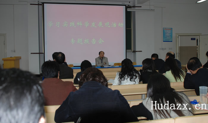10月27日,学院学习实践科学发展观活动领导小组办公室在4—108多媒体教室举行报告会,邀请副院长刘刚教授作学习科学发展观的专题报告。报告会由党委副书记黄安全主持,全院党员到会听讲。