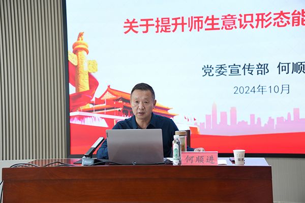 报告中,湖北大学党委宣传部常务副部长何顺进围绕党的二十大和党的二十届三中全会精神,以《关于提升师生意识形态能力的几点思考》为题,从“为什么要重视意识形态能力?”“高校意识形态面临什么挑战?”“高校师生如何提升意识形态能力?”等三个方面进行了全面系统讲解。讲解中,何顺进结合具体案例,重点分析总结了高校意识形态的“四大特点”“四大挑战”、近期高校意识形态面临风险的“五个表现”和社会主义意识形态“六个事关”,强调要提高意识形态鉴别力、学习力、思考力、创新力、表达力,落实意识形态工作责任制,牢牢掌握意识形态工作的领导权、管理权和话语权。