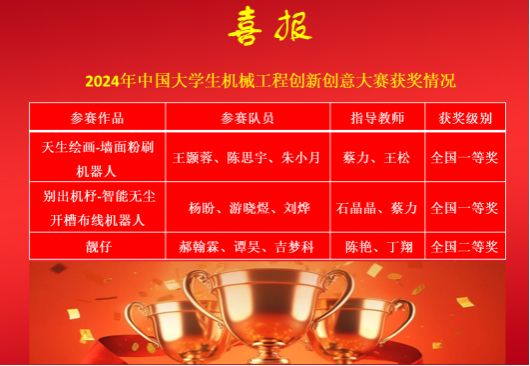 11月8日至9日,由中国机械工程学会主办,华中科技大学、武昌首义学院承办的2024年中国大学生机械工程创新创意大赛(全国总决赛)在武汉举行。经过两天的激烈比拼与智慧碰撞,我校机械与自动化学院的3支参赛队伍脱颖而出,荣获全国一等奖2项、二等奖1项的好成绩,蔡力、石晶晶两位老师荣获优秀指导教师奖。