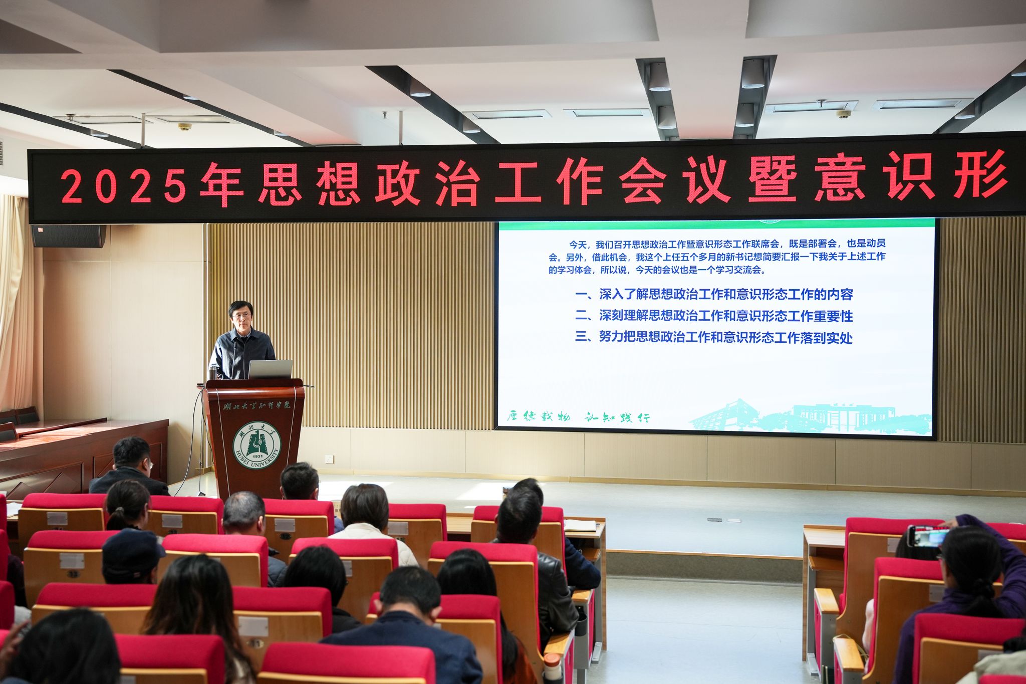 党委书记高连顺以“努力把思想政治工作和意识形态工作落到实处”为题,从三个方面深刻阐述了加强和改进学校思想政治工作和意识形态工作的极端重要性。他强调,思想政治工作是党的优良传统、鲜明特色和突出政治优势,要通过对《中国共产党思想政治工作条例》的深入学习,进一步明确工作内容,把握工作原则,创新工作方法,切实将思想政治工作贯穿于学校各项工作中,充分发挥思想政治工作的引领作用,养成做思想政治工作的习惯,不断提高思想政治工作能力,善于做深入细致的思想政治工作,维护好意识形态安全,更好为学校事业高质量发展提供坚强保障。