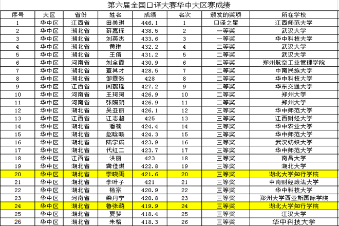 比赛赛制设置为淘汰赛和排位赛,来自湖北、江西、河南三省晋级华中大区赛的89位参赛选手首先进行淘汰赛的比拼,淘汰赛结果依照成绩由高到低顺序排列,前38名进入排位赛。我院外国语系李晓雨和鲁张萌两位同学沉着冷静,凭借扎实的专业功底顺利进入排位赛。其中,李晓雨同学第一轮淘汰赛的优异表现更是赢得了在场评委和观赛师生的一致好评,获得了现场为数不多的高分。在第二轮汉译英排位赛中,两名知行学子展示出了较高的口译能力,她们以清晰完整的思路、流利纯正的英语、凝练工整的翻译语言赢得了评委们的高度评价,最终在38名选手中分别位列第20名和第24名,获得大赛三等奖。据了解,在此前的湖北赛区复赛中,我院外语系李晓雨、鲁张萌、黄兴华、张欢四名同学在与全省130名选手的激烈比拼中表现优异,经过淘汰赛和晋级赛的比拼,李晓雨、鲁张萌两位同学荣获省赛三等奖并顺利入围华中大区赛,黄兴华、张欢两位同学荣获省赛优秀奖。