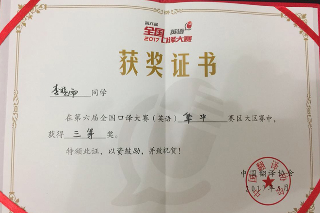 近日,第六届“LSCAT杯”全国口译大赛(英语)华中大区赛在河南郑州大学落下帷幕。我院外国语系英语专业翻译方向1404班李晓雨、鲁张萌两位同学在与包括武汉大学、华中科技大学等众多重点高校学生的比拼中表现突出,均获得华中大区赛三等奖的好成绩。外国语系林名仲老师荣获“优秀指导教师”荣誉称号。李晓雨和鲁张萌也是湖北省39名入围华中大区赛选手的唯一两位独立(民办)院校学生。