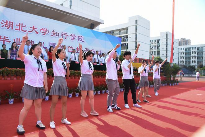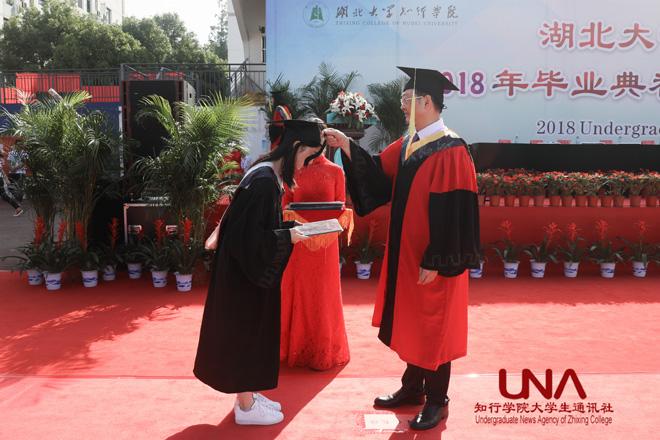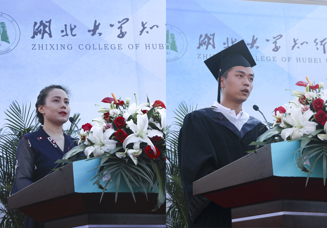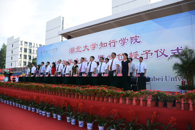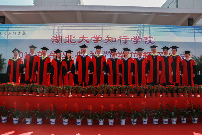 典礼仪式在雄壮的国歌声中开幕。副院长钟春敏宣读学士学位授予决定。党委副书记高志宏宣读优秀毕业生表彰决定。湖北大学副校长蒋涛教授为优秀毕业生颁奖。外国语系辅导员向蕊作为教师代表发言,表达了对毕业生顺利完成学业的祝贺和事业发展的美好祝愿。毕业生代表王旭东在发言中深情回顾了在学校生活学习的点点滴滴,表达了对母校、老师、同学的惜别与祝福。