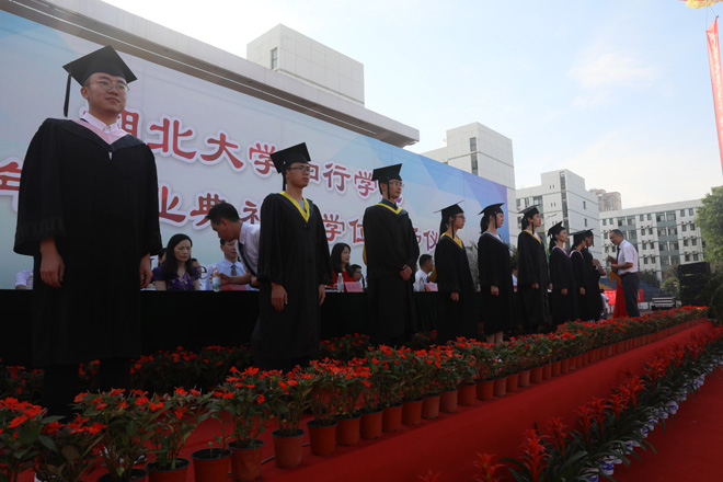 典礼最后,在学院合唱团的领唱下,全场齐唱毕业歌《曾经的你》,引起了强烈的现场共鸣,全体2018届毕业生动情歌唱,优美激昂的旋律在运动场上空久久回荡,不少毕业生和家长更是动情落泪,全体毕业生用一次次雷鸣般的掌声表达了他们对母校的眷恋和对未来的信心。典礼在感怀母校、追忆青春的氛围和依依惜别的歌声中落下帷幕。青春不散场,梦想在前方。母校衷心祝愿同学们前程似锦,平安幸福!欢迎同学们常回家看看!学位授予仪式上,彭德忠书记、卜诗桢院长等学位评定委员会委员为毕业生一一拨穗正冠,授予学位,颁发证书,并与同学们一一合影留念。