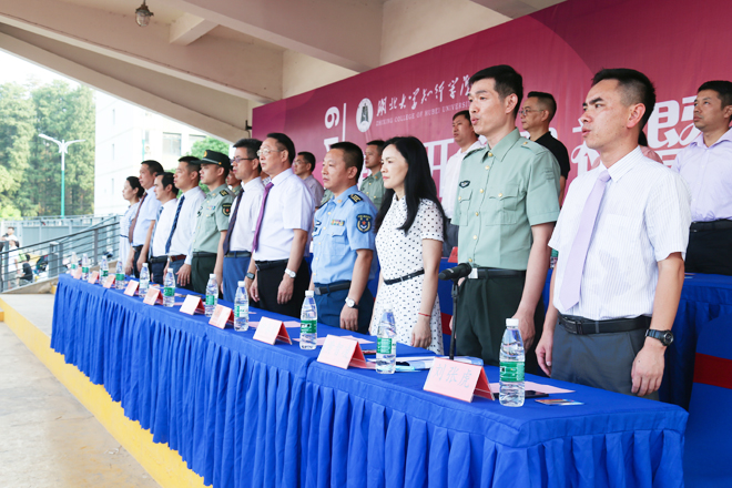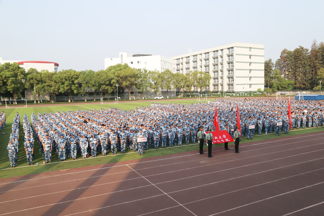9月12日上午,学校在田径运动场隆重举行2019级新生开学典礼暨军训动员大会。江岸区人民武装部副部长吴吉良,承训部队领导李明良,校领导彭德忠、卜诗桢、高志宏、钟春敏、陈刚、王文凯、陈惠、刘张虎和相关职能部门、各学院负责人出席典礼。典礼由副校长黄智凌主持。