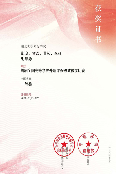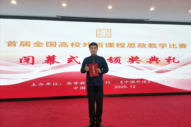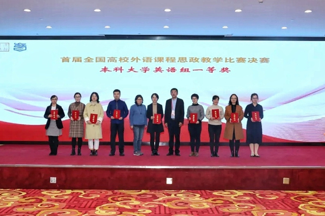 12月20日,由高等教育出版社、《中国外语》杂志主办的首届全国高校外语课程思政教学比赛在北京落下帷幕。我校外国语学院教师团队在与中国人民大学、上海交通大学、大连理工大学、湖南大学等多所全国“双一流”高校教师团队同台竞技中勇创佳绩,其中,郑晓、贺欢、董筠、李硕、毛津源组成的教师团队荣获全国本科大学英语组一等奖;葛春霞、冯健、伍澄、祝娟、王丹教师团队荣获本科英语专业组二等奖。