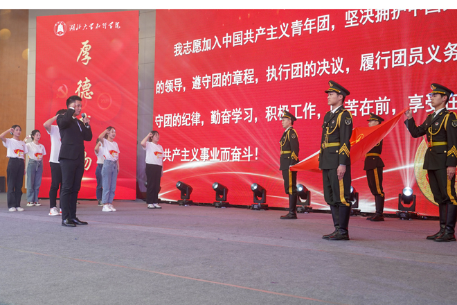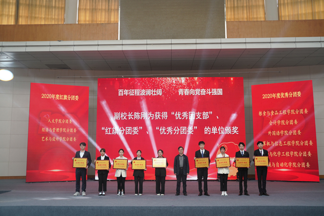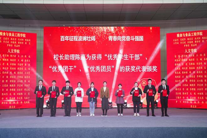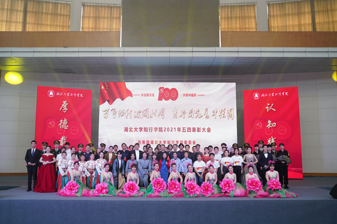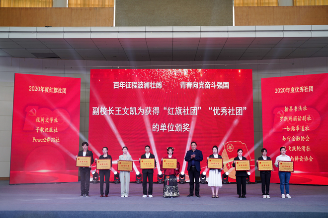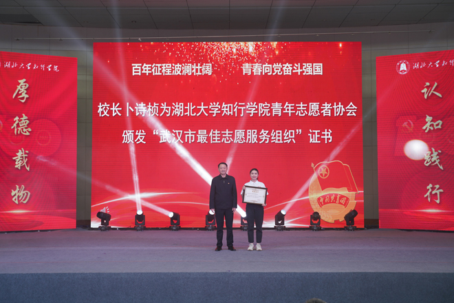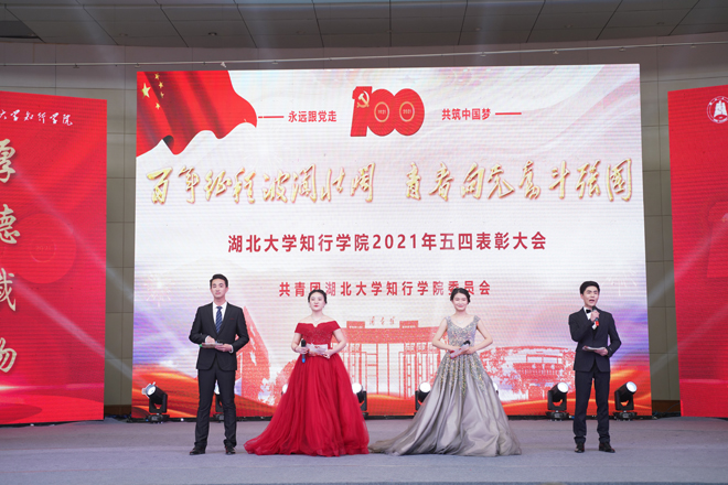 大会开始前,与会人员共同观看了我校共青团工作回顾视频。大会分为“践行青春使命 讴歌百年征程”“凝聚青春力量 书写战疫华章”“唱响青春旋律 献礼建党百年”三个篇章。红色舞剧《忠魂》拉开了表彰大会序幕。随后,全体起立,高唱国歌。大会对优秀团干部、优秀共青团员、优秀学生干部、红旗社团、优秀社团、红旗分团委、优秀分团委、疫情防控优秀志愿者等先进集体和个人进行了表彰,校领导分别为先进集体和个人颁奖。校长卜诗桢为学校青年志愿者协会颁发“武汉市最佳志愿服务组织”证书。期间,新入团的团员进行了庄严的宣誓。文艺表演中,知行师生紧紧围绕庆祝党的百年华诞主题,自编自导创作表演的《舞肆》《传奇》《一心向党》《盛世》《祝福祖国》等节目主题鲜明、极富感染力,引发现场师生强烈共鸣,进一步激发了师生的爱党爱国爱校情怀。