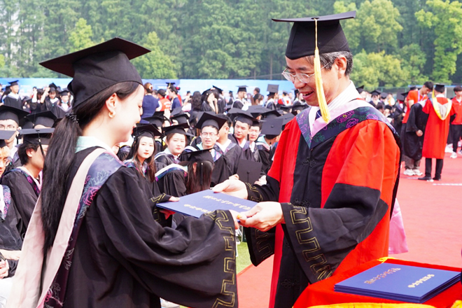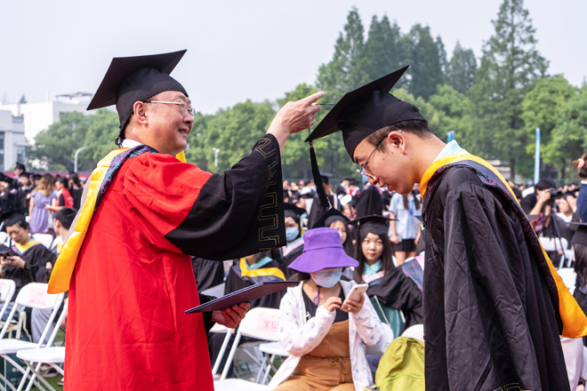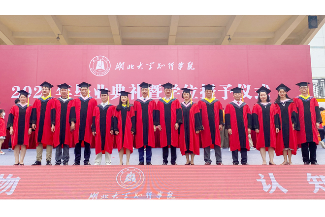 毕业典礼结束后,副校长黄智凌主持学位授予仪式,副校长、学位评定委员会副主席钟春敏宣读学位授予决定。校党委书记彭德忠、校长卜诗桢和学位评定委员会主礼教授共同为获得学士学位的毕业生正冠拨穗,并合影留念。