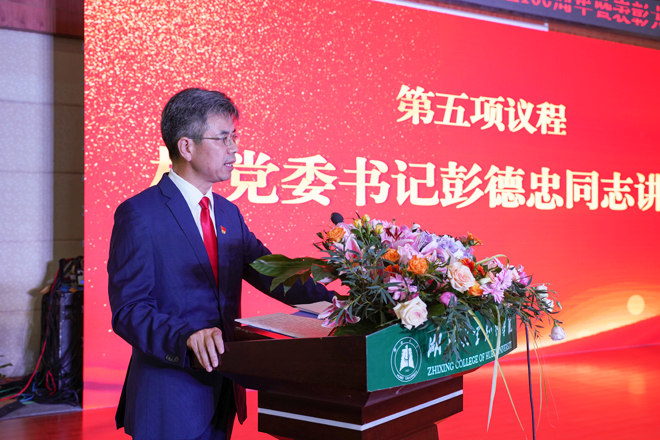 彭德忠结合学校事业发展向学校各级党组织和广大党员提出五点希望和要求:一是要永葆本色讲政治。要切实提高政治站位,增强政治能力,树牢“四个意识”,坚定“四个自信”,做到“两个维护”; 要自觉坚持党的教育方针,牢记“为党育人、为国育才”的使命,全面落实立德树人根本任务,努力培养德智体美劳全面发展的社会主义建设者和接班人;要保持奋发有为的进取精神,立足新发展阶段,贯彻新发展理念,构建新发展格局,笃定服务初心,担负发展使命,忠诚党的教育事业,积极为党工作,努力推动学校各项事业不断迈上新台阶。二是要思想领航举旗帜。要高举马克思主义伟大旗帜,认真学习马克思主义及其中国化的理论成果。要从党的百年奋斗史中感悟真理的力量,用马克思主义的真理光芒照耀我们的前行之路,用马克思主义中国化最新理论成果武装头脑、指导实践、推动工作。三是要赓续传统学党史。要以党史学习教育为契机,用党的奋斗历程和伟大成就鼓舞斗志、指引方向,用党的光荣传统和优良作风坚定信念、凝聚力量,用党的历史经验和实践创造砥砺品格、开拓前进。四是要坚守初心担使命。要从党的百年奋斗史中不断体悟初心使命,贯彻好以人民为中心的发展思想,推动学校各项事业可持续发展。他强调,学校各基层党组织要充分发挥战斗堡垒作用,以高质量党建引领学校事业高质量发展;党员领导干部要发挥好“领头雁”作用,带头履职尽责,带头担当作为,履行好学校党的建设、改革发展、安全稳定各项职责;广大党员要立足岗位、创先争优,发挥先锋模范作用,不断提高教书育人的能力和服务治理的水平。五是要自我革命做表率。要增强忧患意识,推进自我革命,以永远在路上的坚定执着将全面从严治党向纵深推进;要高度重视作风建设,不断加强自身修养,做到明大德、守公德、严私德;要不断提高政治判断力、政治领悟力、政治执行力,始终做一名合格的共产党员。