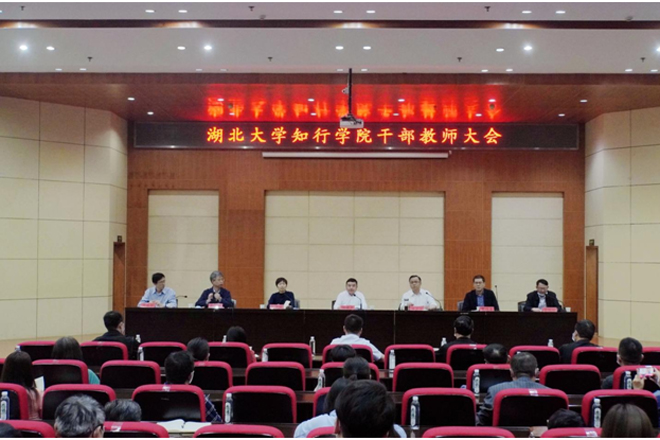4月22日下午,湖北大学知行学院召开干部教师大会,宣布湖北大学党委决定:高连顺同志任湖北大学知行学院党委委员、院长。卜诗桢同志因年龄原因不再担任湖北大学知行学院院长、党委委员。湖北大学党委副书记、校长刘建平出席会议并讲话。湖北大学党委常委章天金主持会议。湖北大学党委组织部、学科建设与发展规划处负责人,知行学院班子成员、全体中层干部和教师代表参加会议。