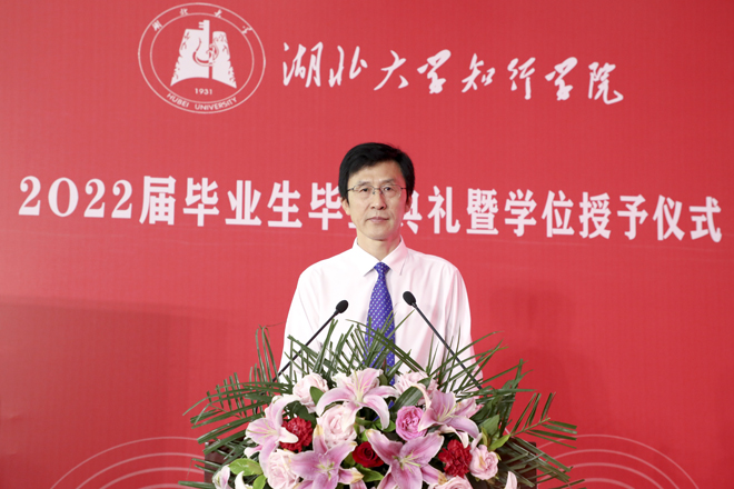 6月16日上午,湖北大学知行学院2022年毕业典礼暨学位授予仪式通过线上线下结合的方式隆重举行。学校3236名毕业生满载希望开启人生新航程。党委书记彭德忠,院长高连顺,副院长钟春敏、陈刚、王文凯、吕露超,党委委员刘张虎,相关单位和各二级学院负责人,教师和毕业生代表出席活动。党委副书记黄智凌主持典礼。