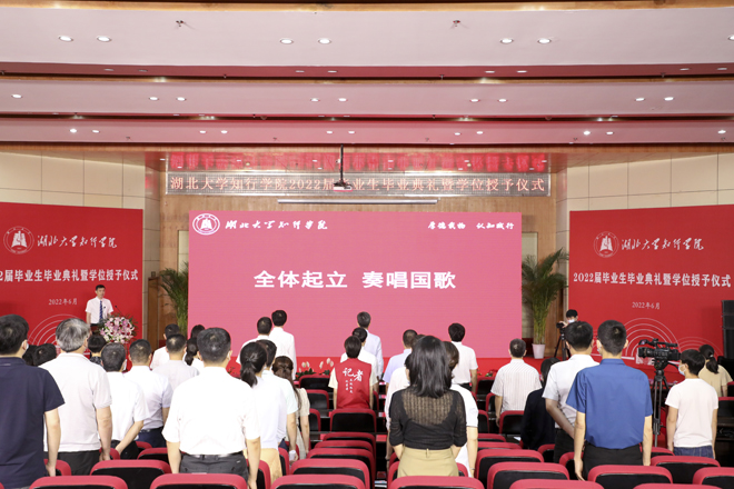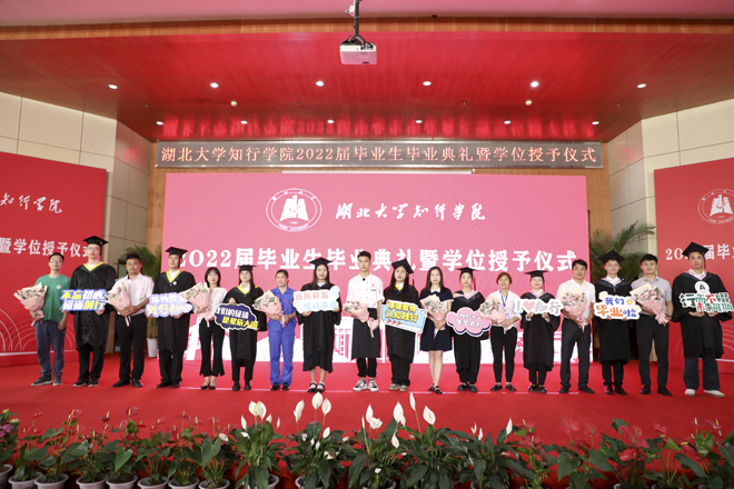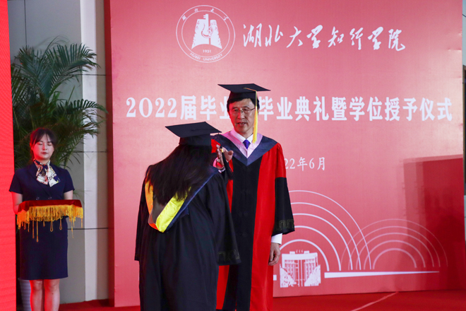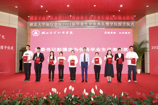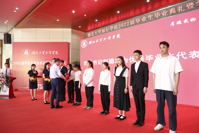 典礼在雄壮的国歌声中开始。彭德忠为2022届优秀毕业生代表颁发证书。肖俊飞等324名同学荣获“优秀毕业生”荣誉称号,他们勤奋好学、勇于担当,展现了知行学子的良好精神风貌和崇高品德。