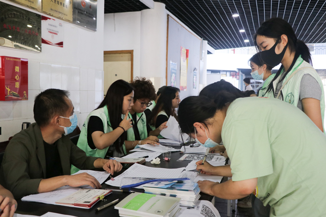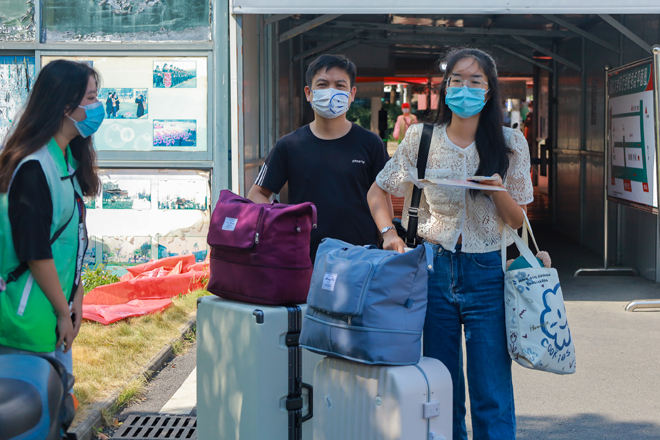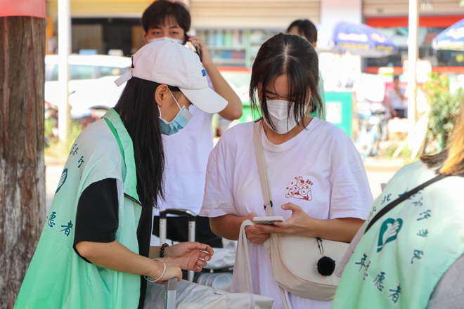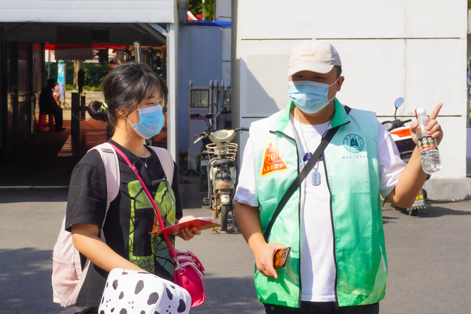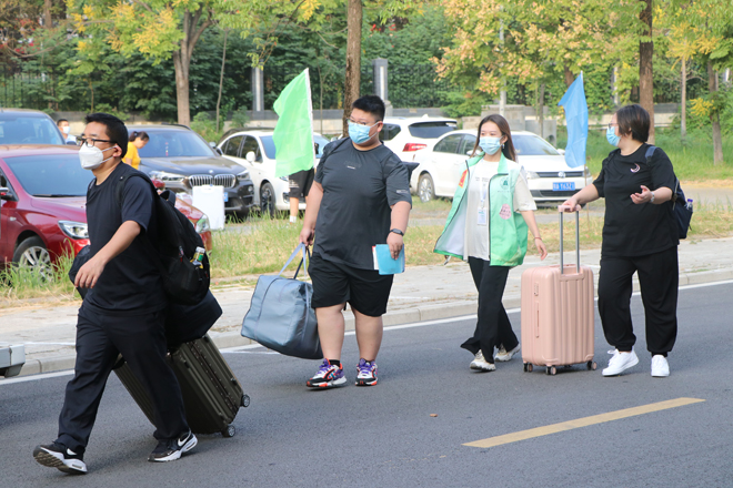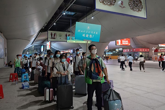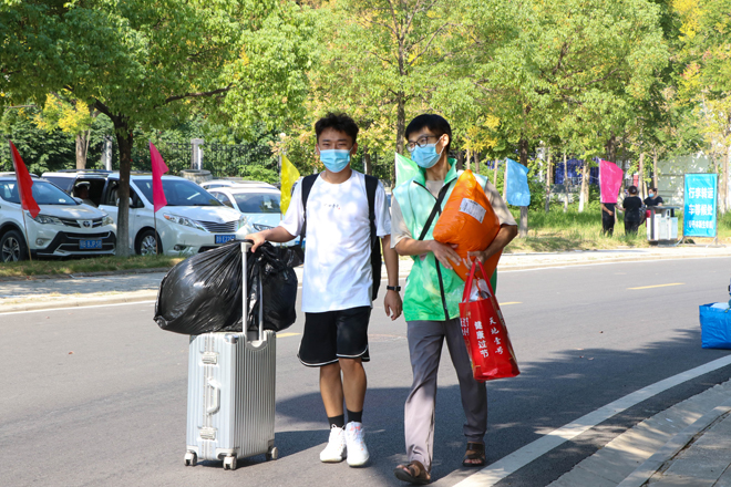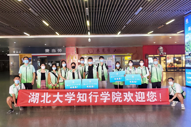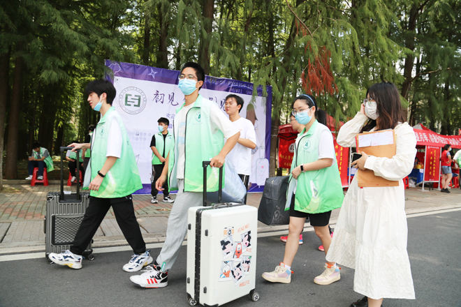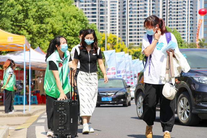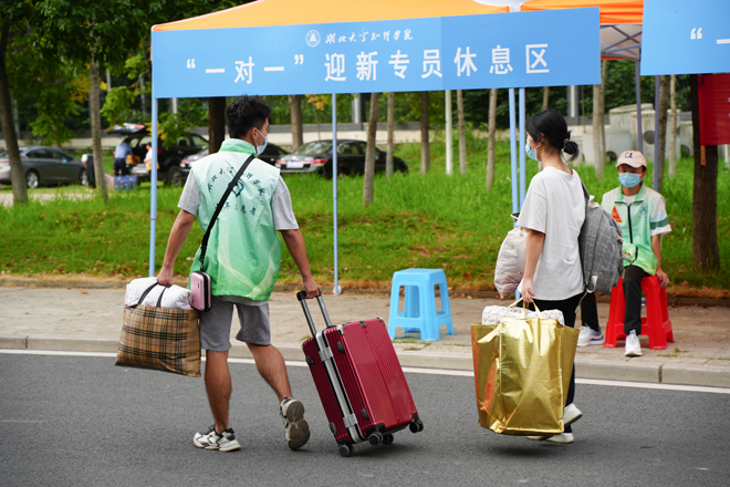 迎新日一大早,知行校园内外处处都是忙碌的身影,相关职能部门、各二级学院的教职工和学生志愿者早早来到迎新岗位做好迎新准备工作。校外迎新点志愿者跟随着迎新车辆奔赴武昌火车站、汉口火车站和武汉火车站迎接新同学。校园内醒目的指示牌、“一对一”的新生志愿服务、为学生托运行李的摆渡车,处处体现着学校细心周到的服务。“能够帮助到学弟学妹们觉得很快乐,特别是听到他们说出那一句‘谢谢’的时候很感动。”英语专业2002班的志愿者曹敏同学开心地说到。从校门口的身份验证扫码测温,到协助新生搬运行李至宿舍,再到一对一带领新生完成报到手续,学生志愿者的无私奉献成为了知行校园迎新期间的一道靓丽风景线。