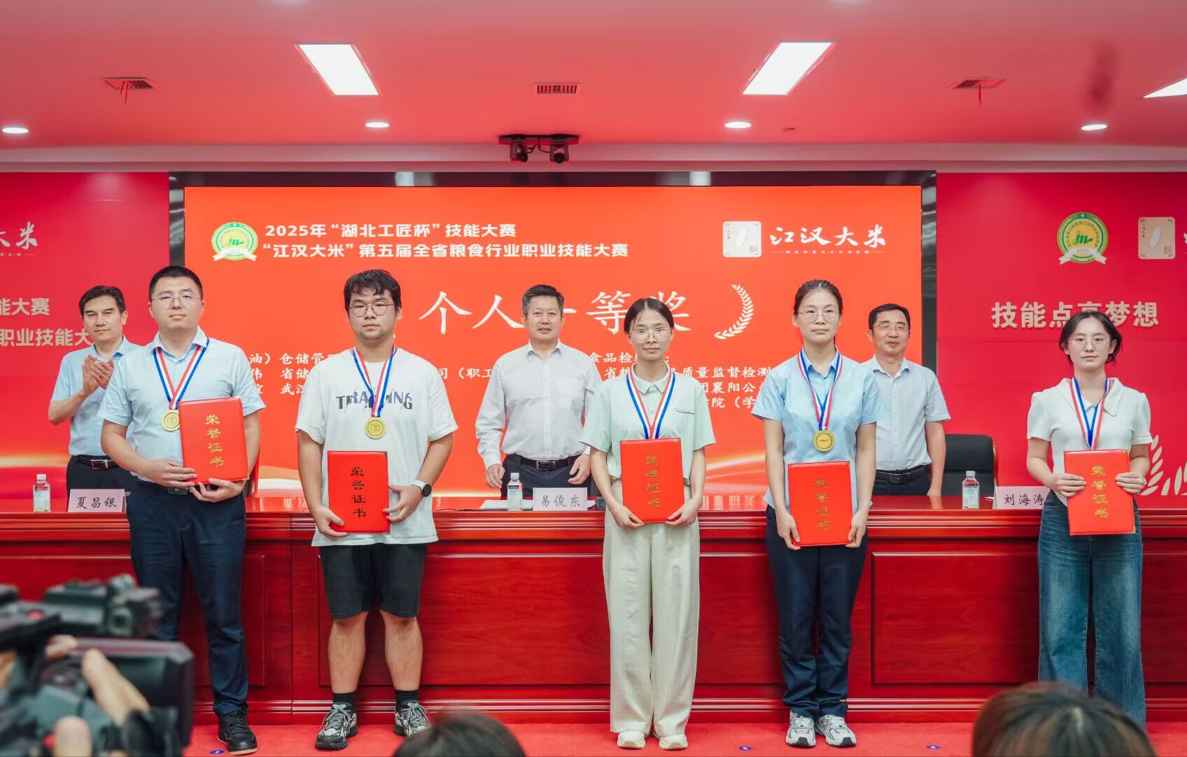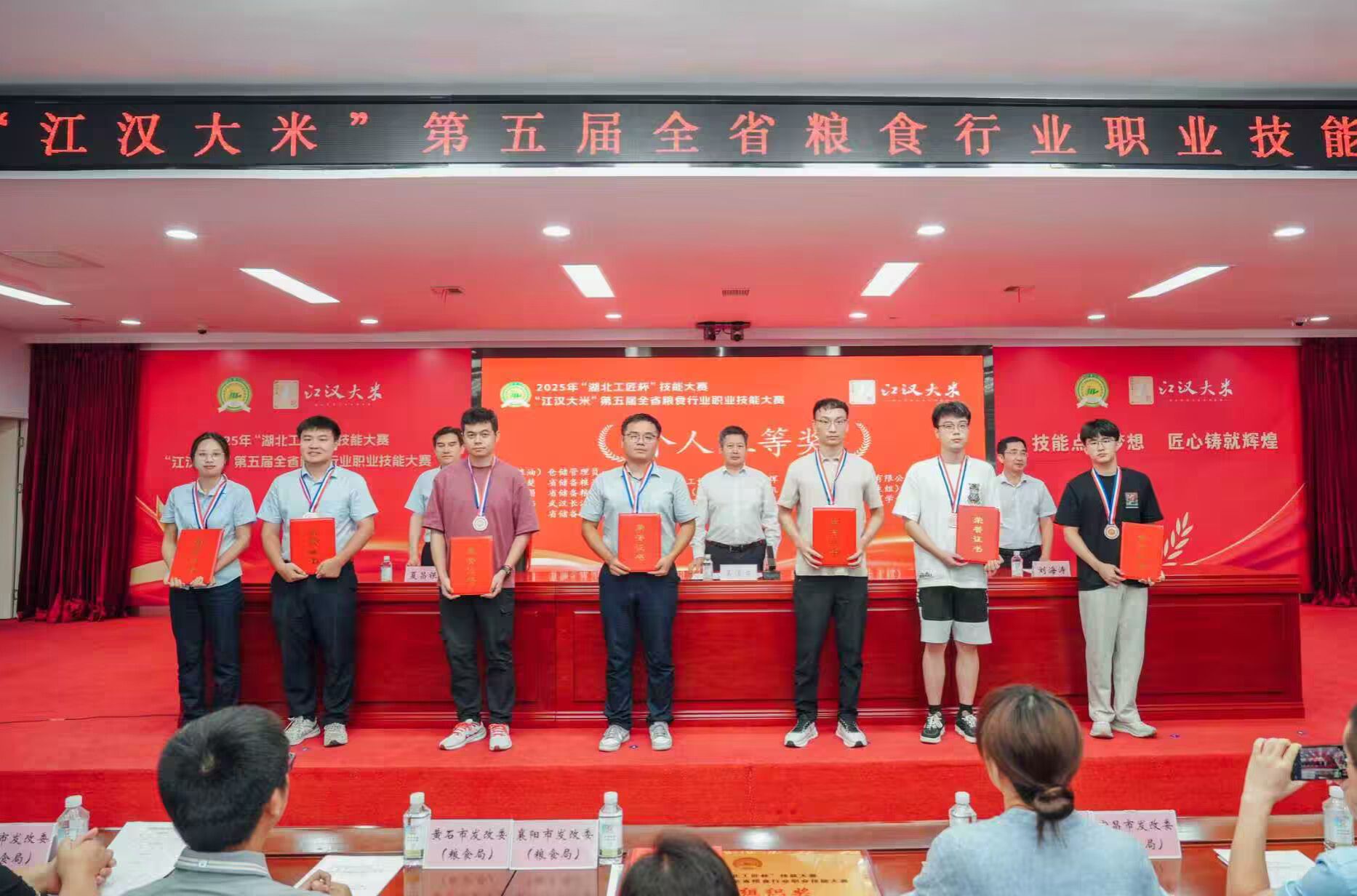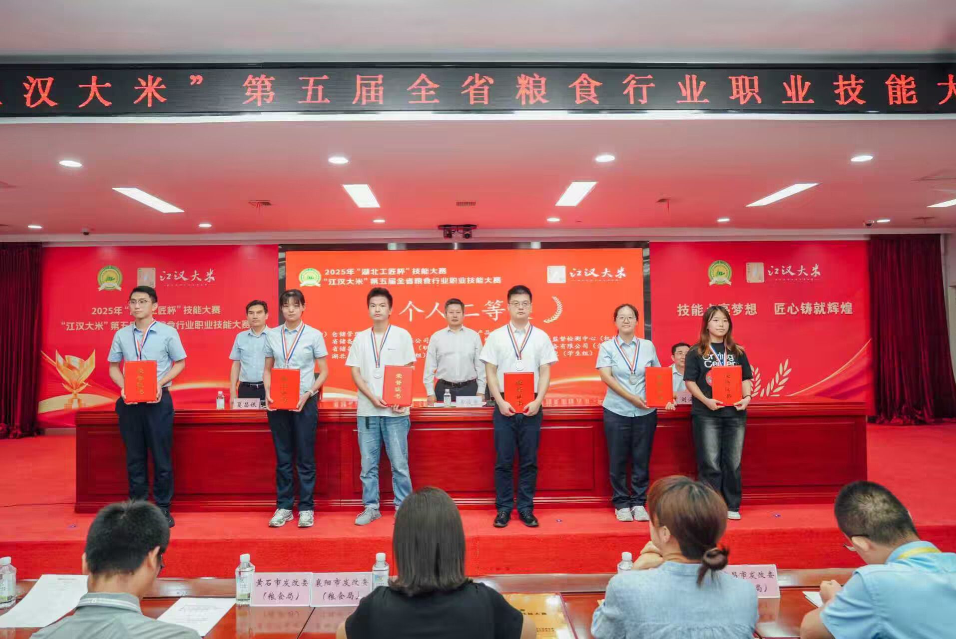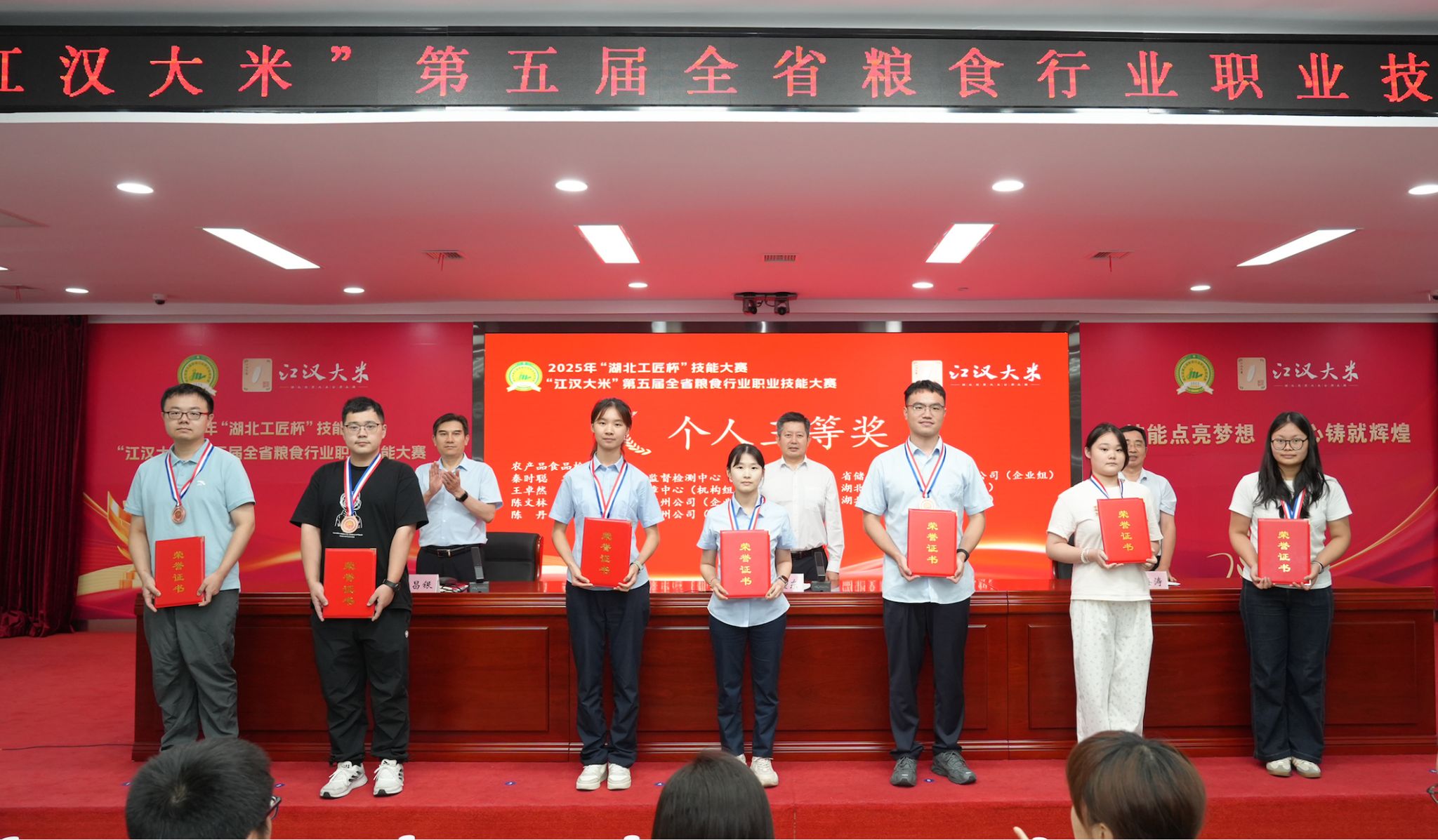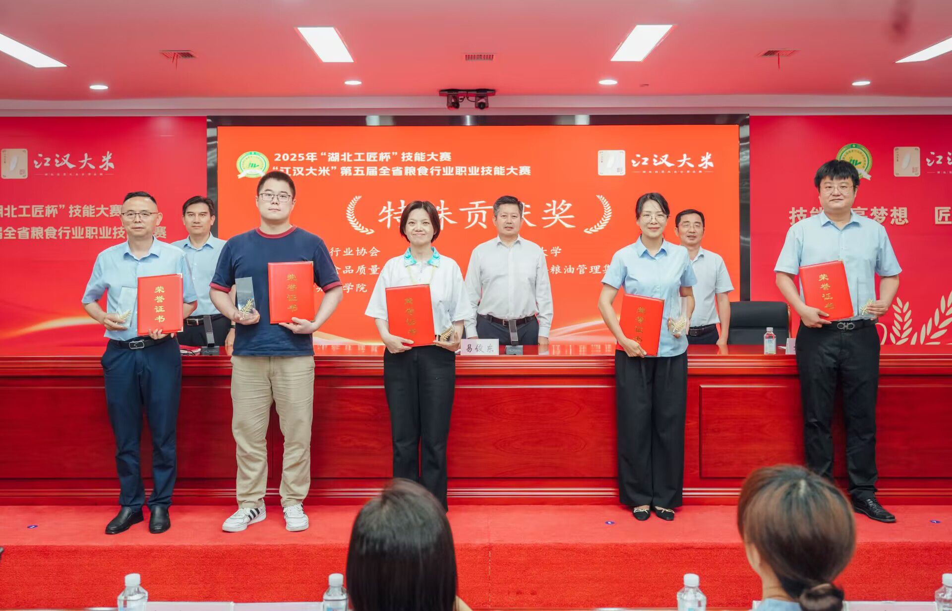 7月21日至22日,由湖北省发改委、省粮食局、省人社厅、省总工会共同主办,省粮食行业协会、武汉轻工大学、省粮油食品质量监督检测中心、省储备粮油管理集团有限公司联合承办的2025年“湖北工匠杯”技能大赛暨“江汉大米”第五届全省粮食行业职业技能大赛决赛在武汉举行。我校粮食与食品工程学院熊深思、向诗慧、尚乐、潘盼、熊智齐、肖栎文六名同学喜获佳绩,包揽农产品食品检验员职业工种学生组一、二、三等奖,荣获仓储管理员职业工种学生组二、三等奖,获奖学生将代表湖北省参加第六届全国粮食行业职业技能大赛。学校同时荣获本次大赛特殊贡献奖。副院长刘齐代表学校参加颁奖仪式。