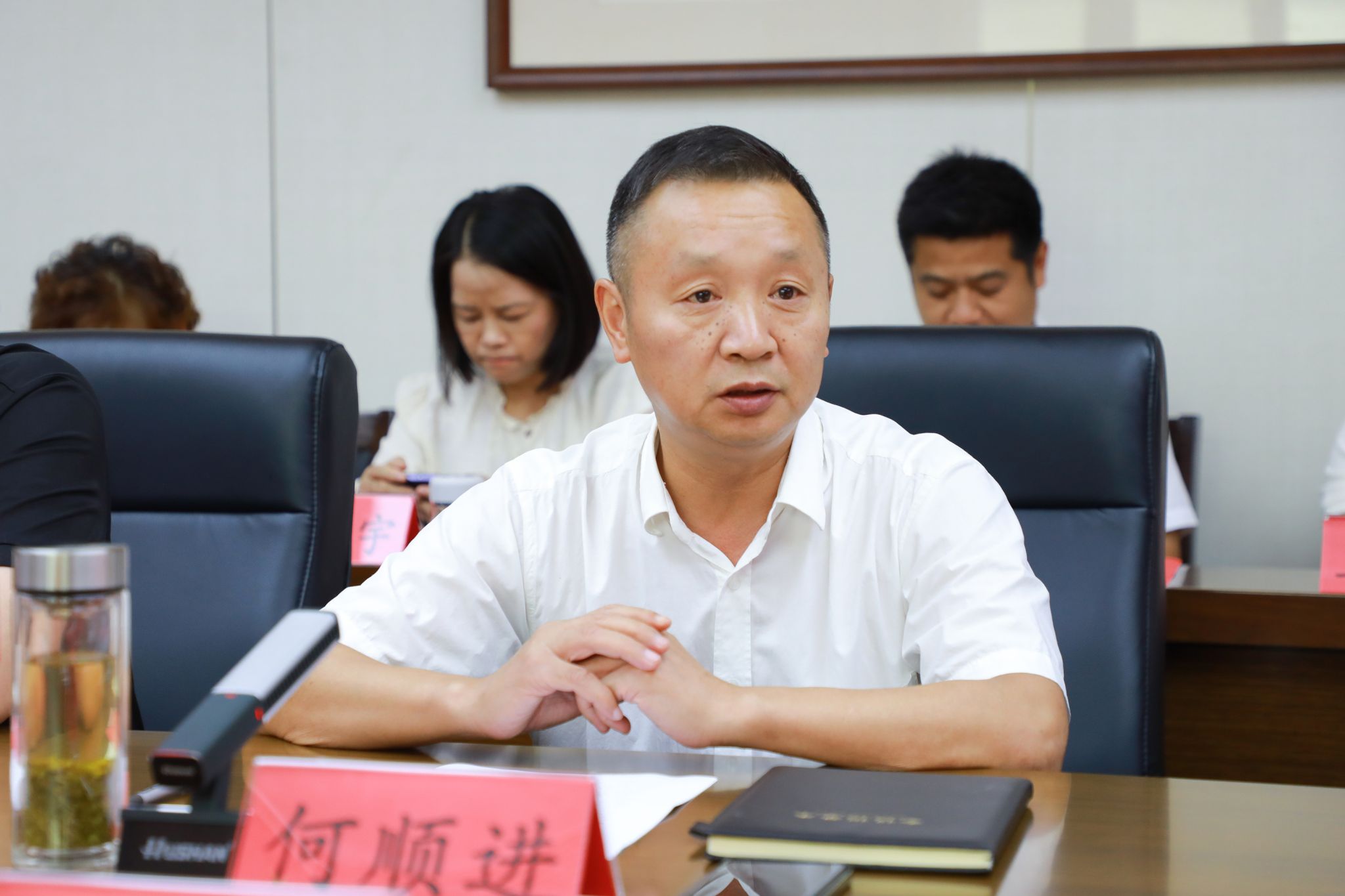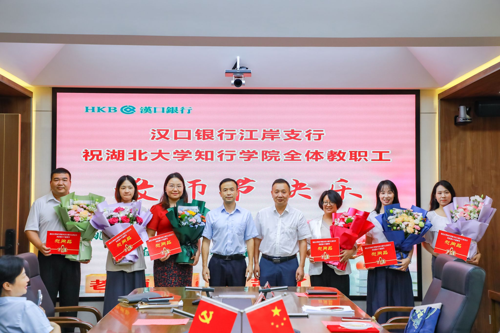 会后,院长何顺进和校企合作单位汉口银行江岸支行副行长黄凯共同为受表彰的教职工个人颁发鲜花和纪念品。