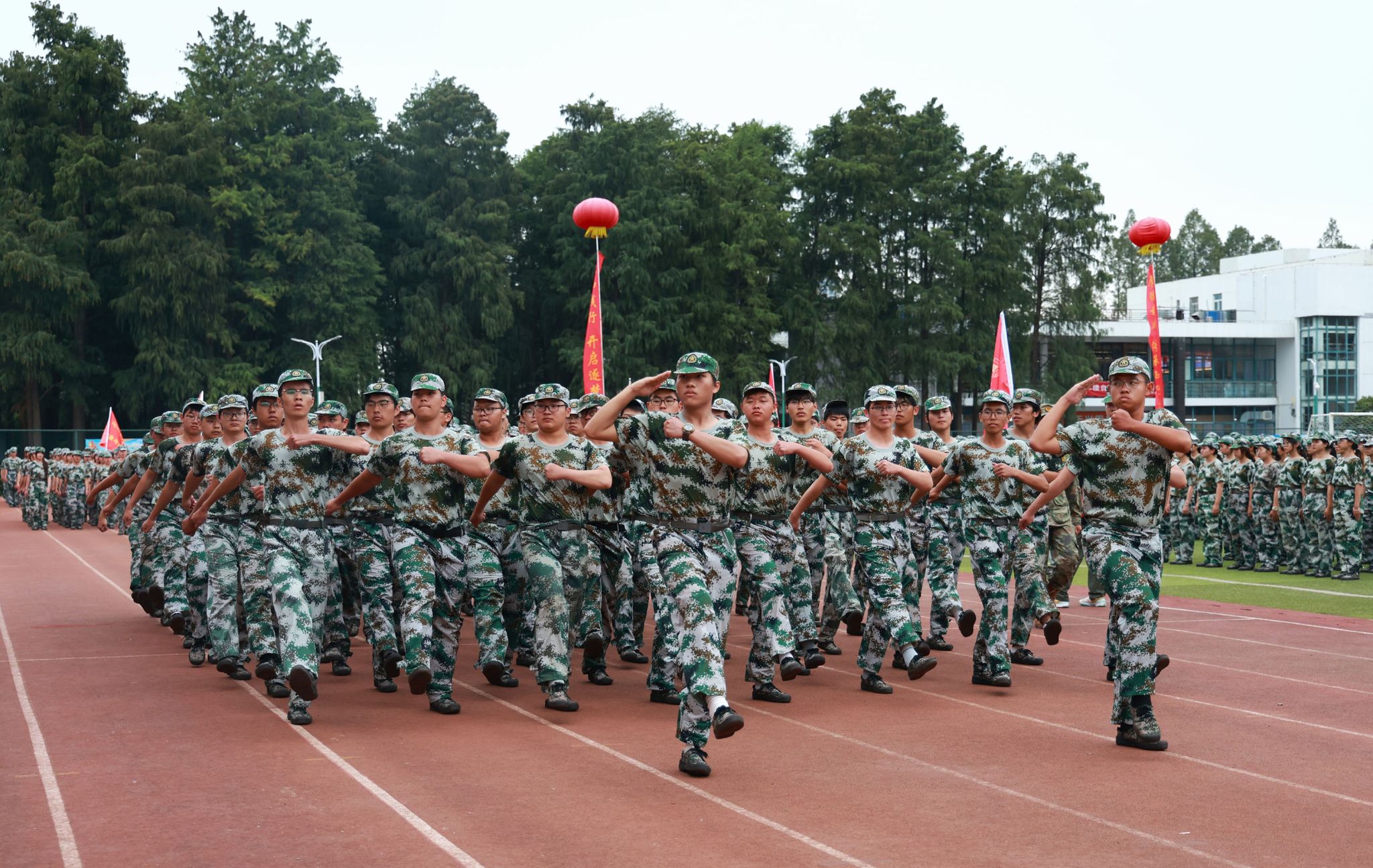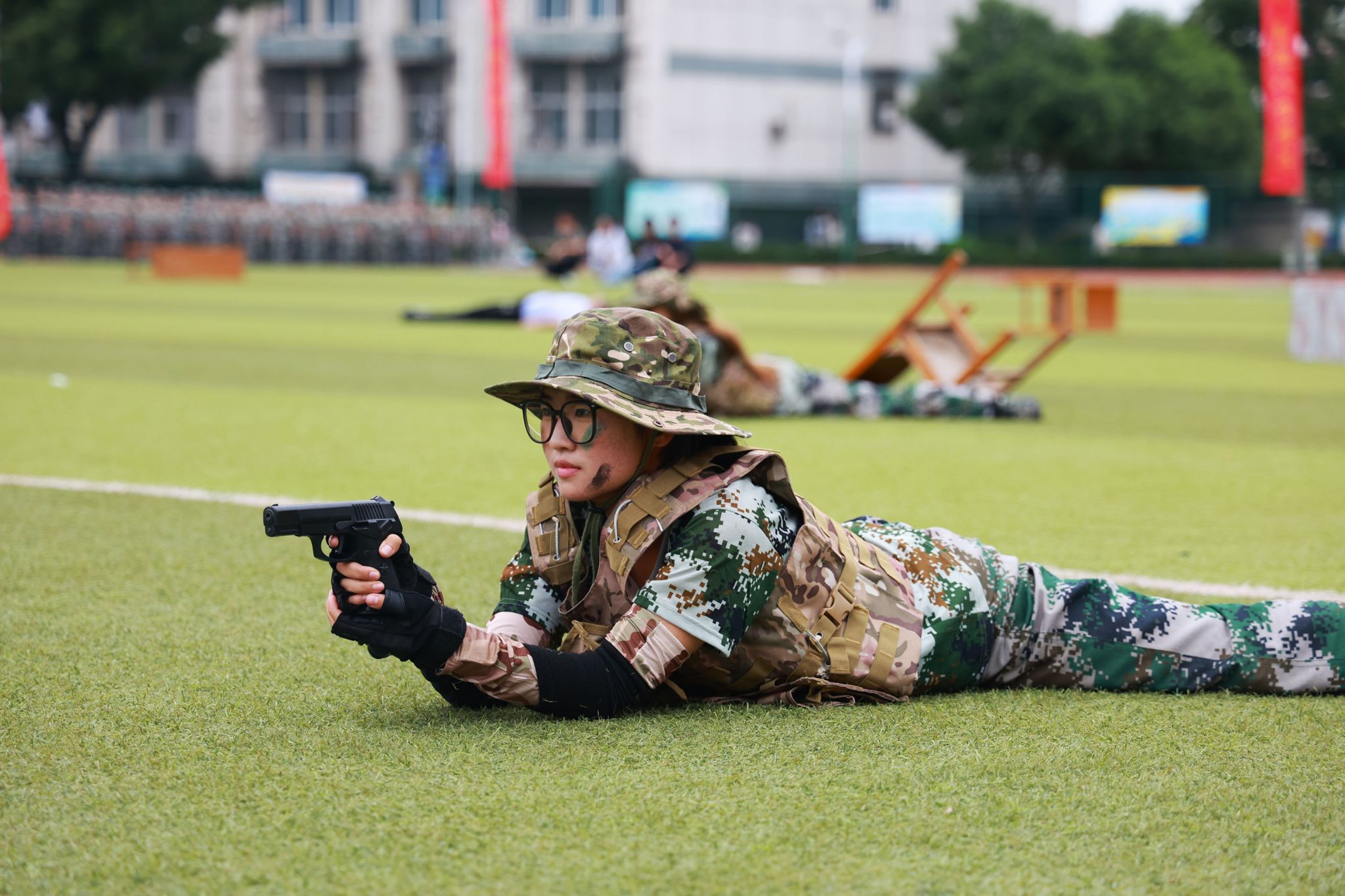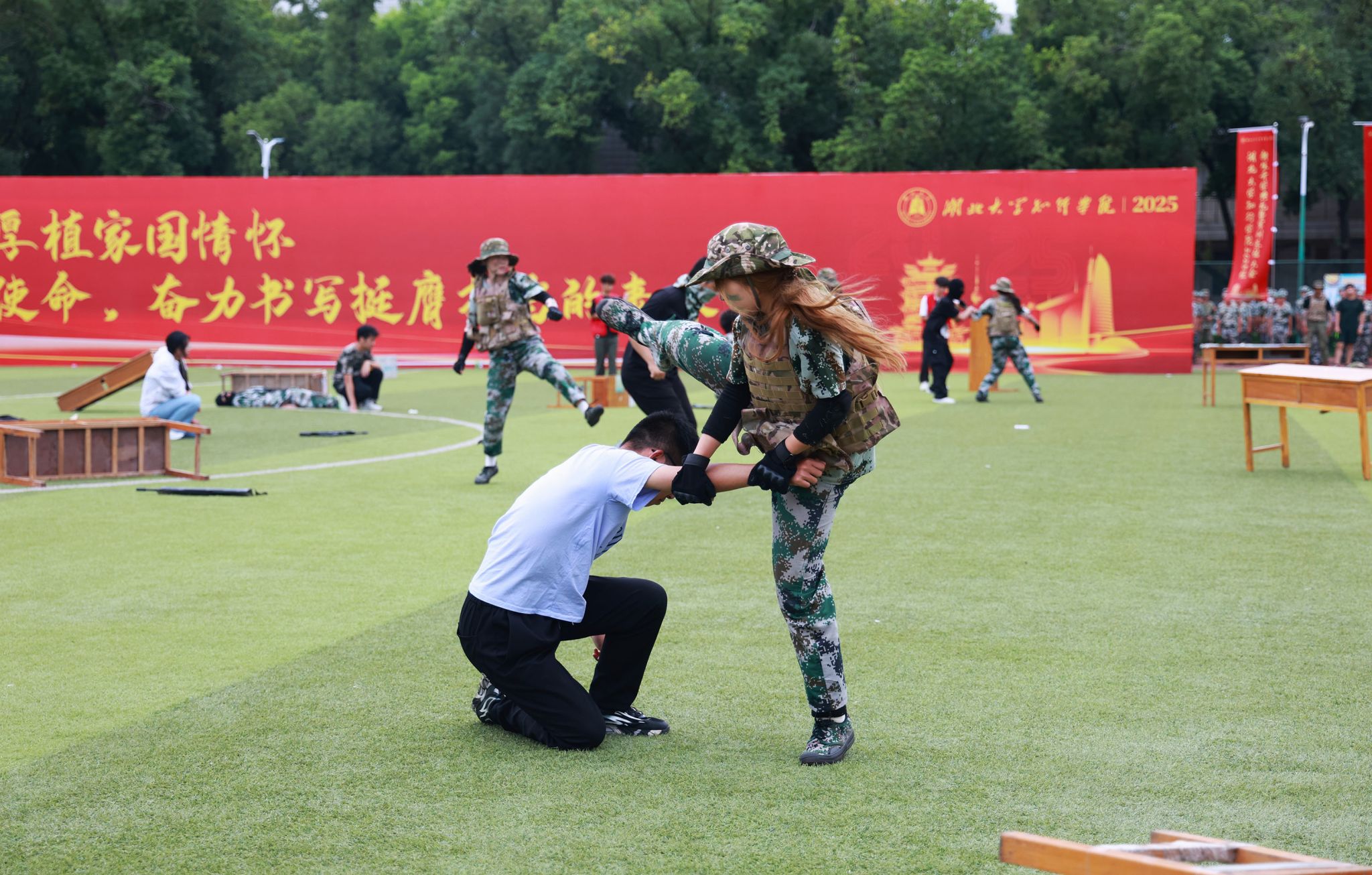 大会在庄严的国歌声中拉开帷幕,全体师生起立,迎国旗、奏唱国歌,表达对祖国的无限热爱与崇高敬意。随后,军训成果汇报精彩上演:匕首操方阵动作整齐划一,擒敌术方阵虎虎生风,战术连模拟实战紧张激烈,分列式步伐铿锵有力,充分展现了2025级新生经过军训洗礼后的飒爽英姿与昂扬斗志,赢得了现场阵阵掌声。