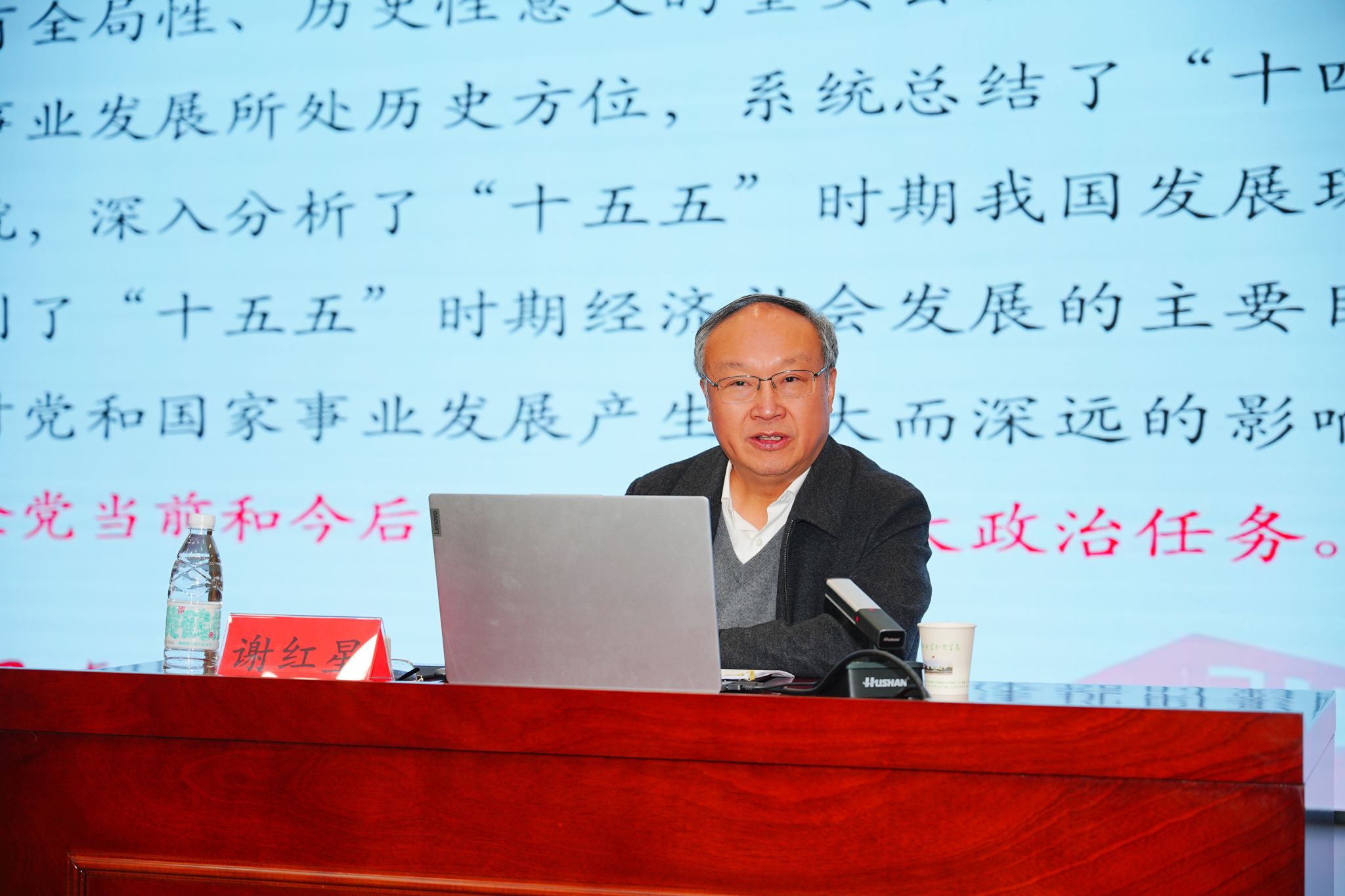 报告中,谢红星以《续写“两大奇迹”新篇章  开创中国式现代化建设新局面》为题,从“读懂制度优势:五年规划是党治国理政重要经验”“把握战略部署:党的二十届四中全会的主要内容”“引领强国建设:高等教育改革发展的形势与任务”等三个方面进行了全面讲解辅导。