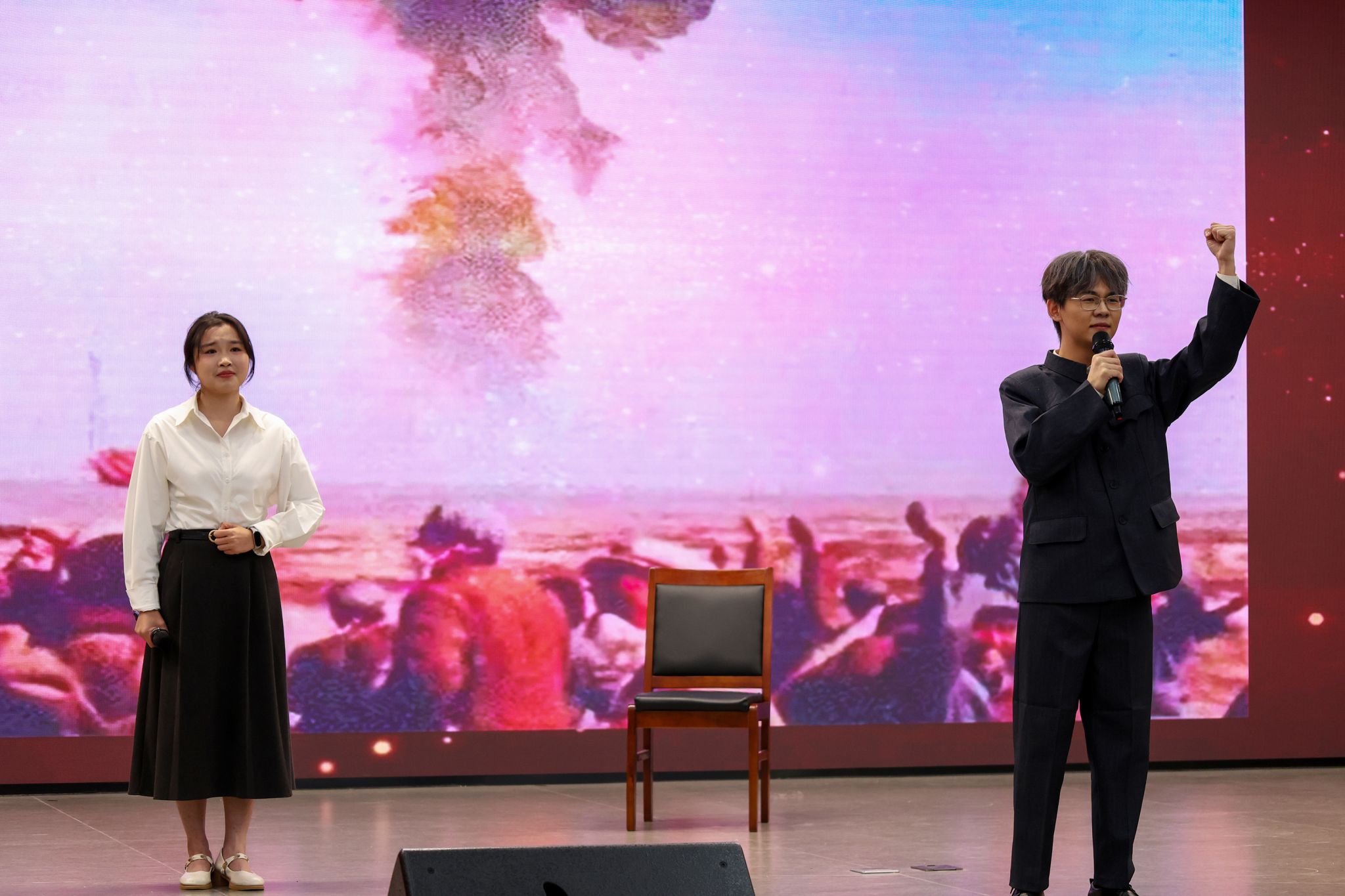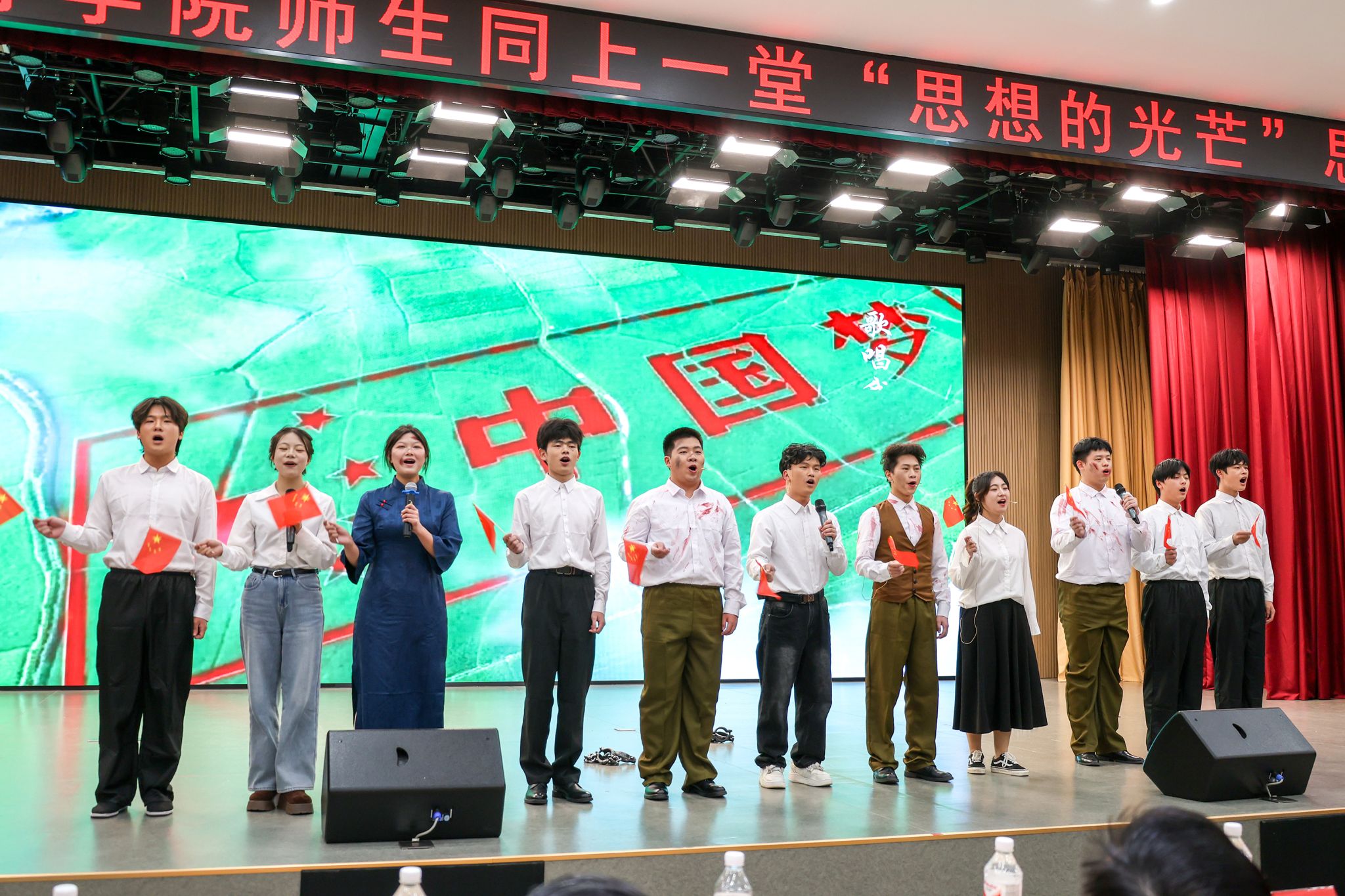 20多个音乐、影视、诵读作品贯穿整场思政课。朗诵《牺牲》回顾了革命先辈不屈斗争的精神伟力,朗诵《等待》阐述了新中国建设者们波澜壮阔的奋斗历程,女生小合唱《十送红军》彰显共产党人自信自强、坚韧不拔的革命精神,舞蹈《鼓声响起的地方》生动展现了中华民族一家亲,歌曲《一起向未来》将十八大以来党和国家的非凡成就一一呈现,歌曲《我和我的祖国》《我爱你中国》表达了知行师生浓浓的家国情怀,赢得现场阵阵掌声。