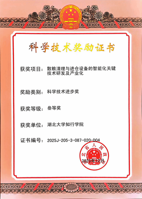 近日,湖北省科技创新大会在洪山礼堂隆重举行。由我校机械与自动化学院团队作为核心完成人的项目《散粮清理与进仓设备的智能化关键技术研发与产业化》荣获2025年湖北省科技进步奖三等奖。