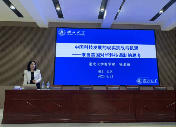 讲座中,喻春娇教授以“中国科技发展的现实挑战与机遇 ——来自美国对华科技遏制的思考”为题进行了讲解。她指出,科技竞争已成为大国博弈核心领域,美国从技术霸权护持、产业链重构以及标准体系博弈对华进行科技遏制,“小院高墙”策略正逐步向量子计算、人工智能等前沿科技领域拓展延伸。喻春娇教授以华为鸿蒙生态的 “备胎转正”进程、中兴通讯合规体系重构历程以及海康威视应对实体清单的供应链再造方案为例,深入剖析美国科技封锁对我国高新技术企业带来的冲击,指出在直面严峻挑战的同时,也会由此催生的 “倒逼机制”所带来的全新机遇。