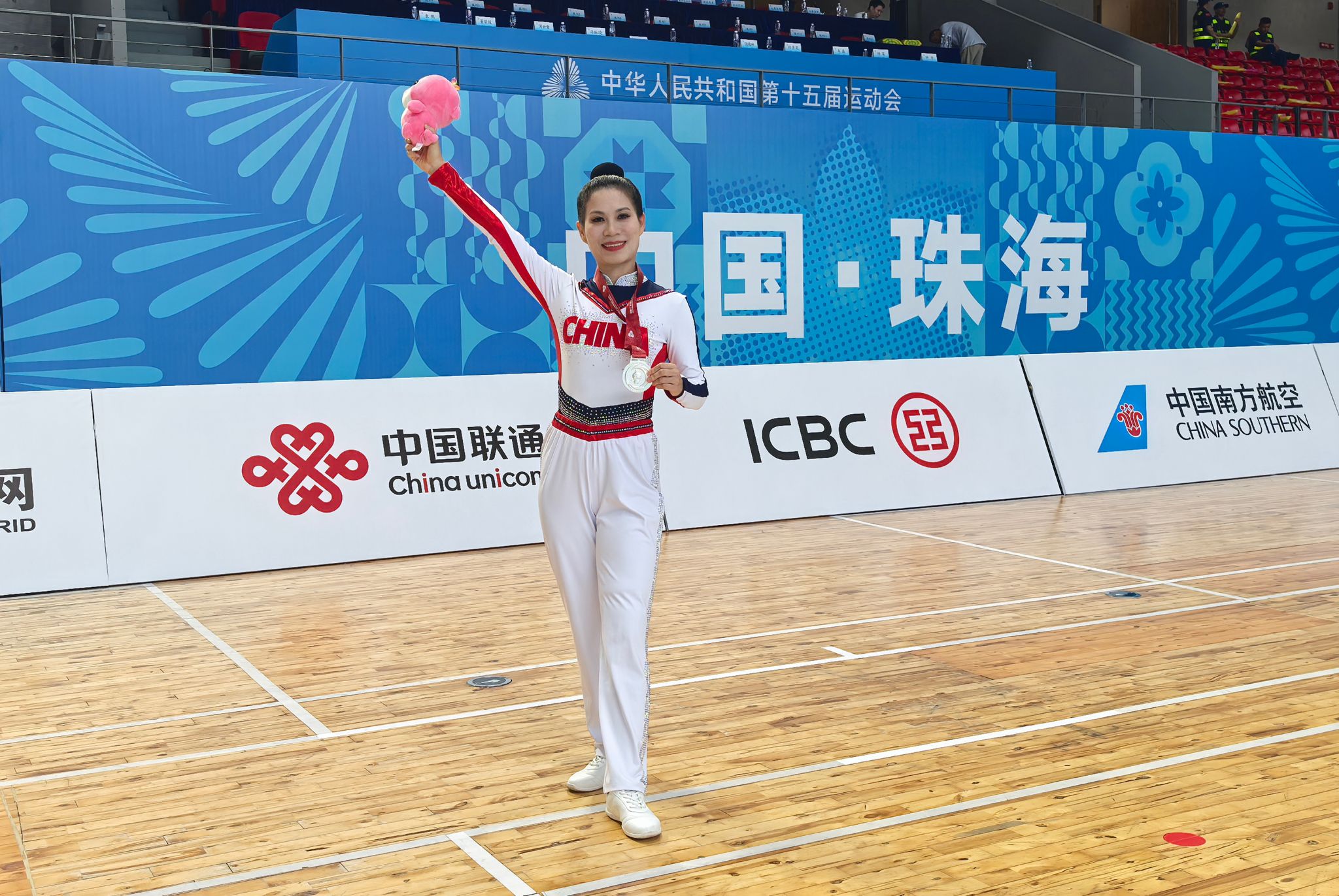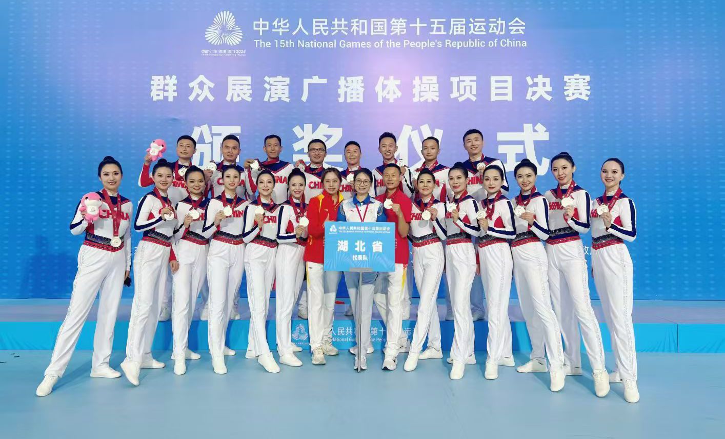 近日,第十五届全运会群众展演项目广播体操项目比拼在中山大学珠海校区举行,经过层层选拔和预赛,湖北省代表队遴选20名运动员参加本次比赛,我校体育教师王红梅作为运动员之一随队获得二等奖。