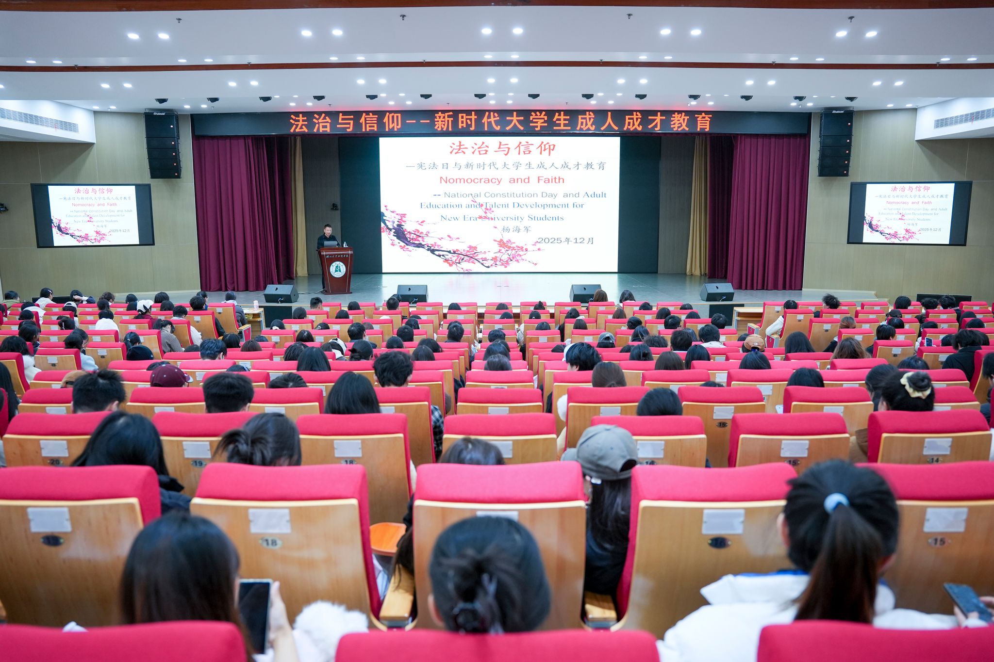 报告会上,杨海军结合二十余年教学科研经历及跨文化交流观察,系统阐释了法治建设对当代大学生成长成才的重要意义。他通过中外社会治理实践对比,深入解析不同制度背景下公民权利的实现方式与责任边界,指出我国法治体系通过明确的行为规范,在保障人民自由的同时筑牢社会安全根基。杨海军特别强调,法治不仅是一套制度安排,更应成为每个人内心的行为自觉。真正的法治社会离不开公民对法律的价值认同与精神信仰,只有内心敬畏规则,才能做到知行合一。他鼓励在场学生在日常学习生活中自觉践行法治精神,将个人理想融入法治中国建设的时代征程。