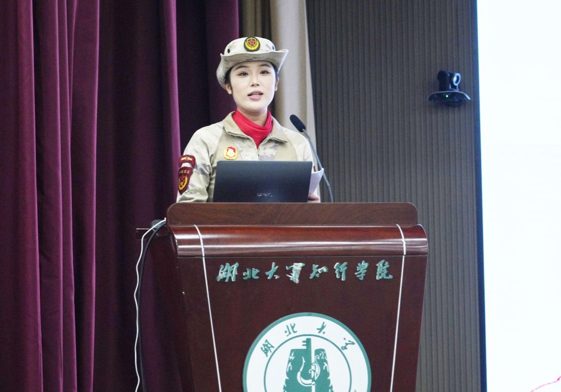周闲深情回顾了自己从大学入伍到成长为一名优秀民兵队员的历程。她自幼受爷爷熏陶,怀揣着对祖国的赤诚热爱和对军人荣誉的向往投身军营。在部队中,她经历了严苛的训练,从基础体能到仪仗动作规范,每一个细节都倾注了无数汗水。凭借着出色的表现,周闲两次入选全国大阅兵队伍,她分享说,为了达到“分秒不差、米秒不误”的精准标准,队员们无论严寒酷暑都反复训练,脚上磨出血泡、大腿拉伤,却无一人退缩。她还展示了训练中的视频,让师生们真切感受到了阅兵背后的艰辛。