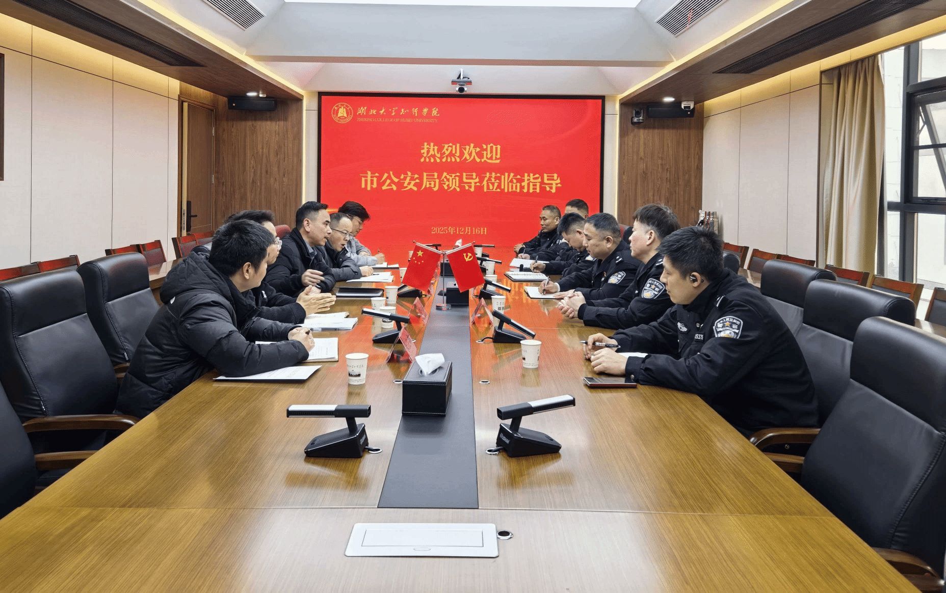 12月17日下午,武汉市公安局经侦支队支队长王鸣一行六人莅临我校调研指导工作。副院长刘张虎主持座谈交流,党委宣传部、学生工作部、保卫部等部门负责同志参加交流。